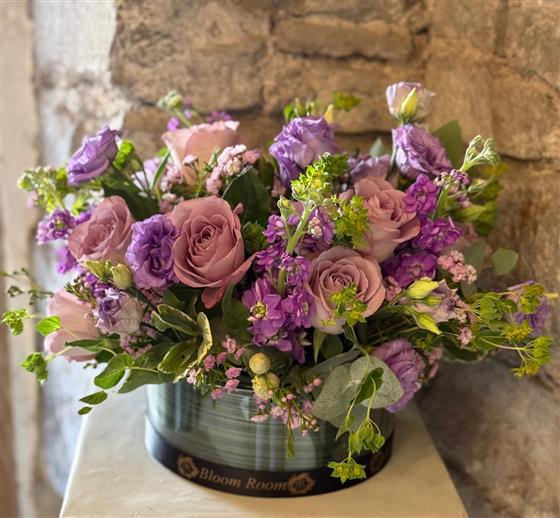 The arrangement is provided in a glass bowl. The display is all about lilac royalty and rich textured lush blooms and unapologetic glam.