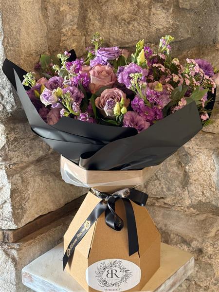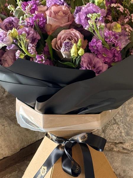 The bouquet displayed is the Drama Queen size. She's elegant, she's extra and she knows it. This bouquet is all about lilac royalty and rich textured lush blooms and unapologetic glam.