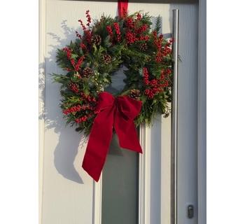 A timeless Christmas wreath crafted to bring festive cheer to any doorway. Lush green foliage forms the base, adorned with clusters of vibrant red berries and rustic pinecones for a natural woodland charm. The design is finished with a luxurious red velvet bow, adding a touch of elegance and tradition. Perfect for creating a warm, inviting entrance, this wreath captures the spirit of the season with classic colours and textures that never go out of style.