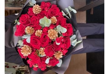 A striking and festive arrangement featuring 24 velvety red roses paired with golden pinecones and sprigs of fresh eucalyptus. The deep crimson blooms bring passion and elegance, while the metallic pinecones add a touch of seasonal luxury. Wrapped in sleek black paper, the bouquet has a modern, dramatic finish that makes it perfect for holiday celebrations, romantic gestures, or stylish décor.